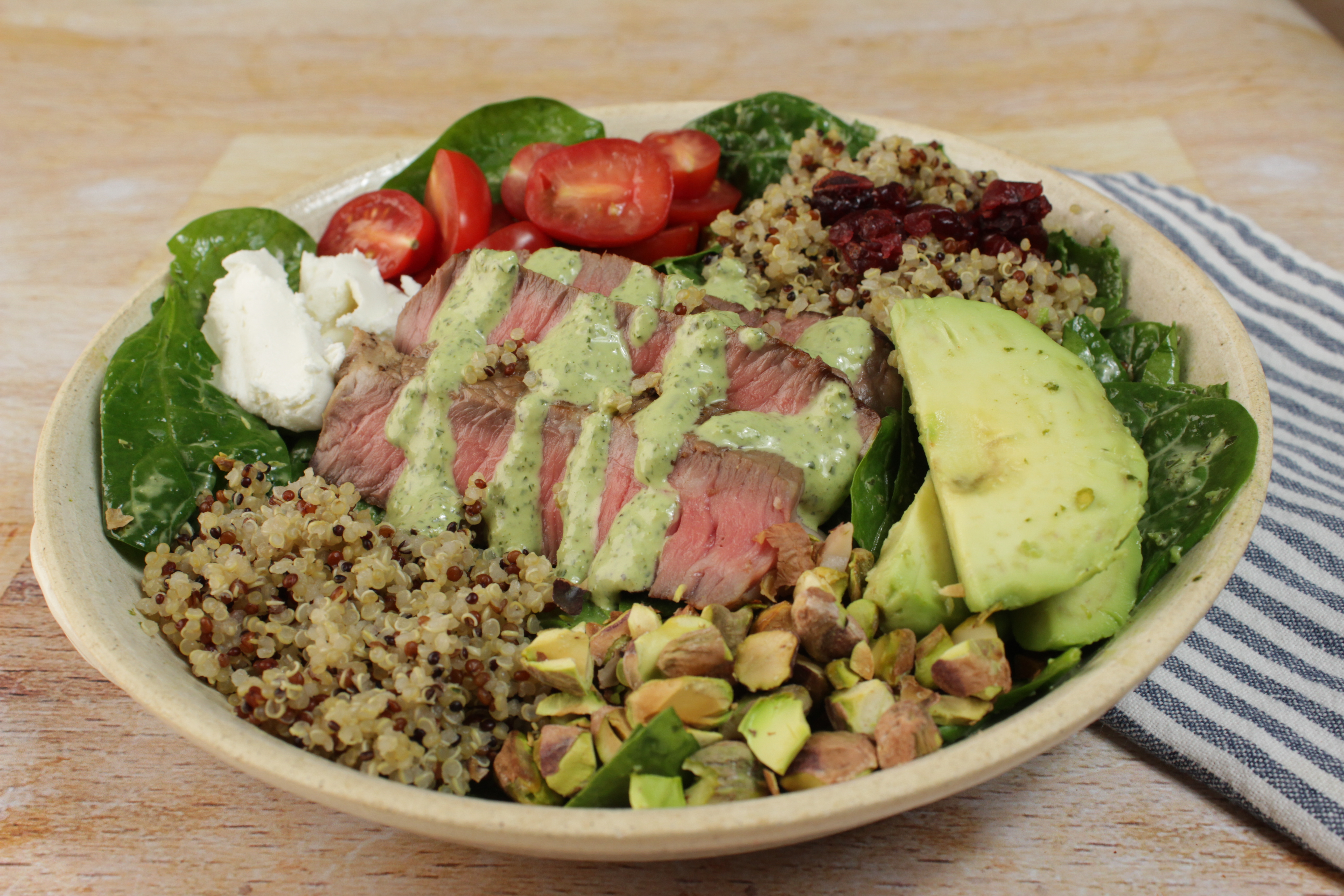 Toss the baby spinach in the prepared dressing, using your desired amount. Top the salad with cooked quinoa, avocado, tomatoes, cranberries, pistachios, steak slices and goat cheese. Drizzle with a bit more dressing and serve at once.