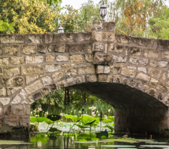 Prairie Pines has garden pathways, waterfalls, a stone bridge, and ponds for visitors to enjoy during open seasons.